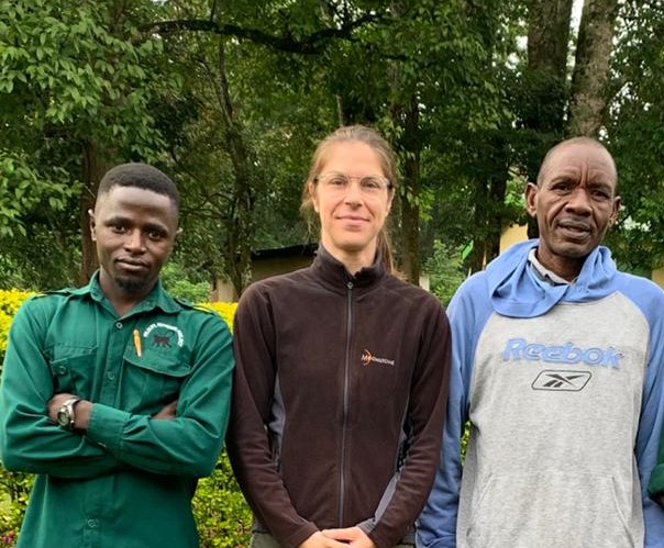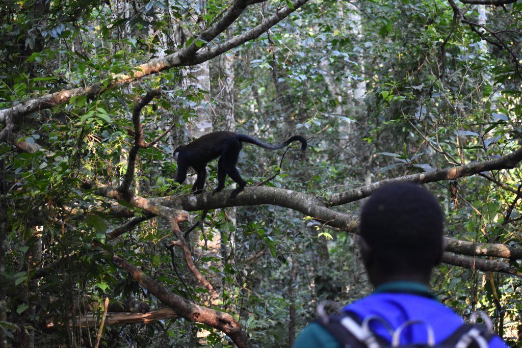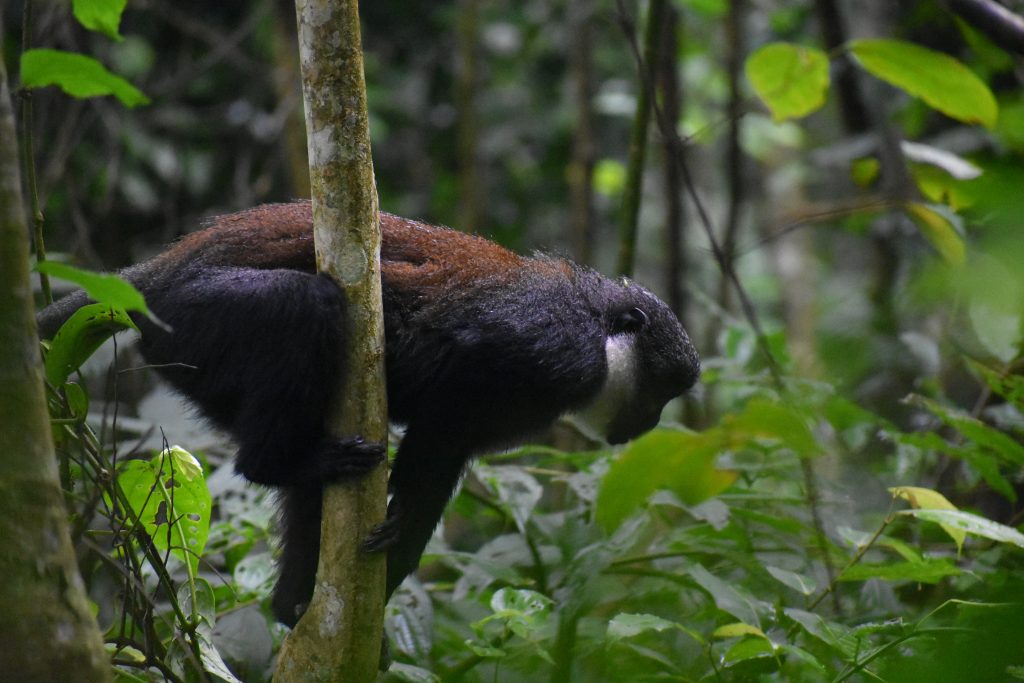 At Kanyawara in Kibale National Park, Uganda, team members John Rusoke and Nelson Mwesige are collecting social and feeding data on our habituated L’Hoest’s monkey group. L’Hoest’s monkeys, also sometimes known as mountain monkeys, are relatively understudied semi-terrestrial guenons.